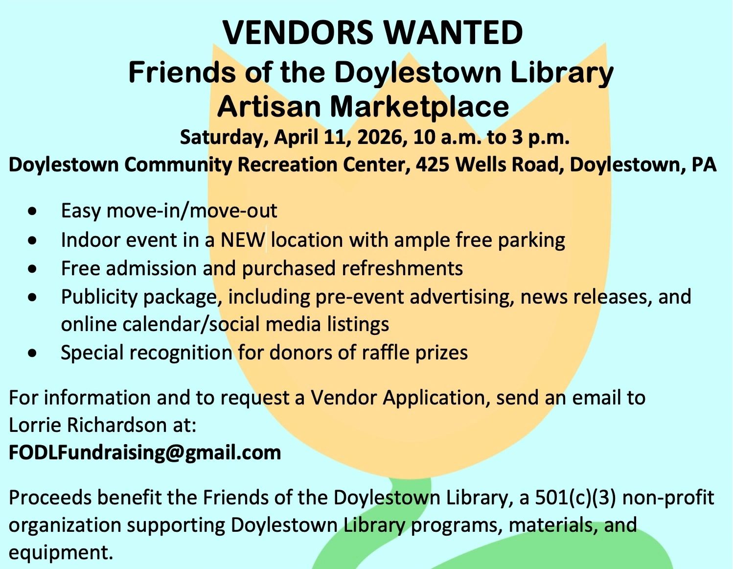 Request a Vendor Application by sending an email to Lorrie RIchardson at FODLfundraising@gmail.com